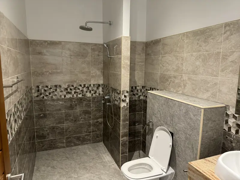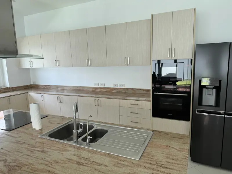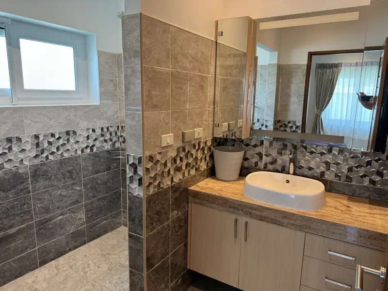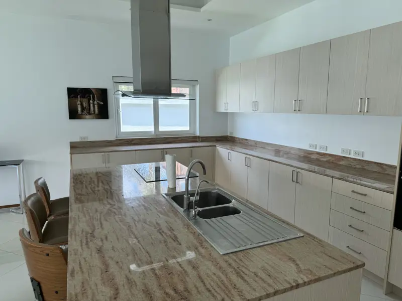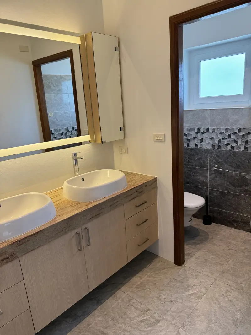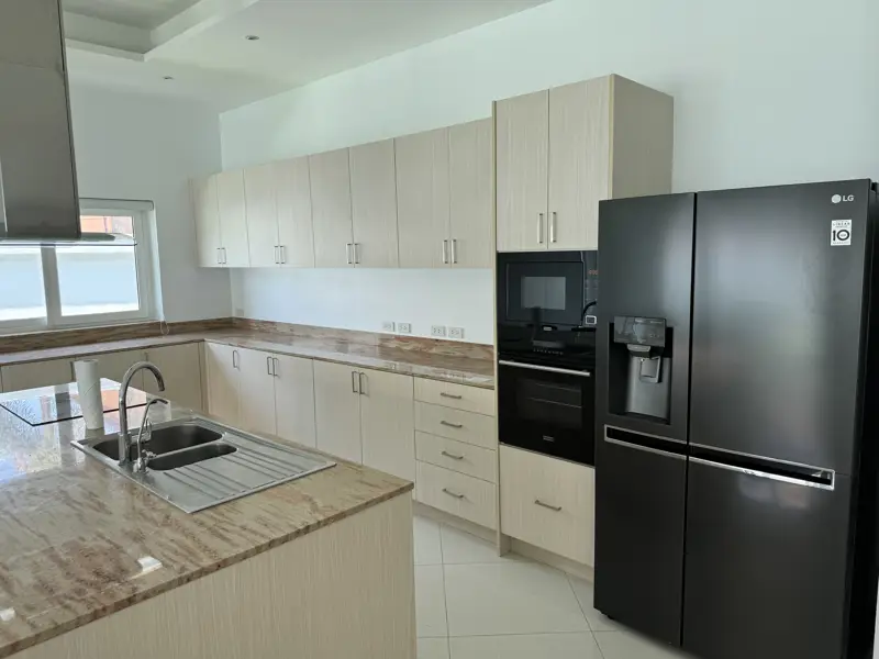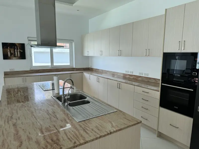 The house is top modern with top European standard of tiles, kitchen, and bathrooms. Double insulated walls, PVC windows and doors with double-glazing. European kitchen with ceramic hob and oven and microwave, extractor fan, granite countertops, Air-Con in all rooms. Built-in wardrobes etc. A very nice and big living room with magnificent kitchen and dining area.