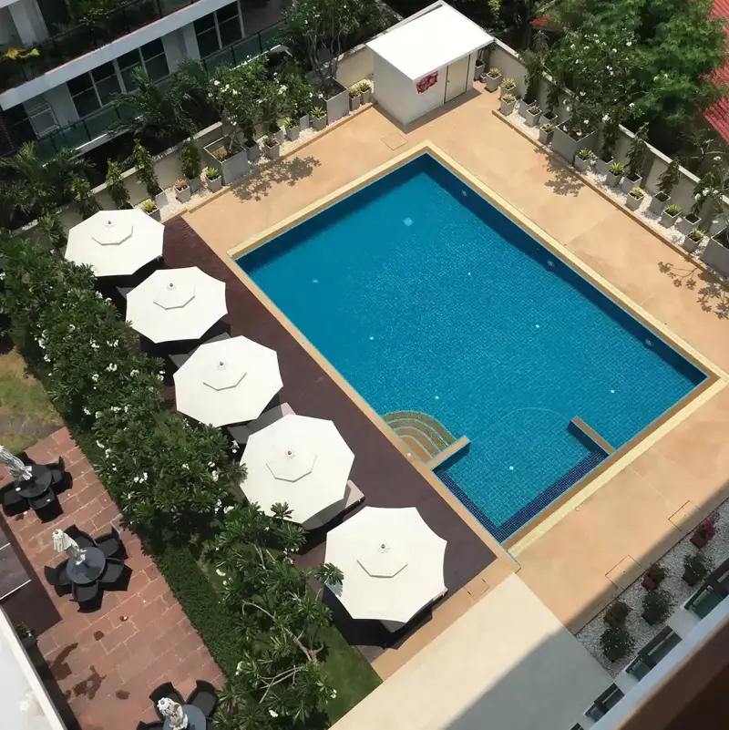 The top facilities include a swimming pool and sundeck, garden, underground car parking, reception, maid service and 24h security. And our own restaurant Café Jensen
