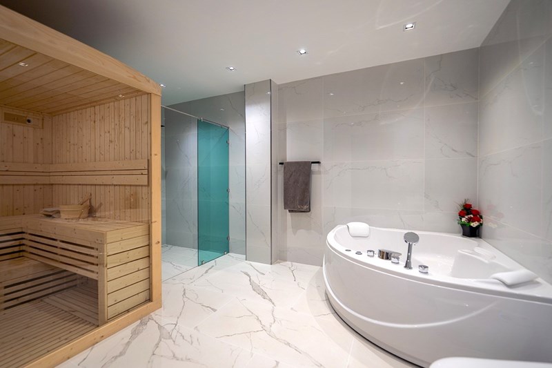 Movie theater room - Spa - 90 sqm Fitness - Sauna - Steam room - Office room - 3 kitchen - Wine cellar - 3 Jacuzzi Bathtubs - Design furniture - and attached guest apartment - Garage for 4 cars - 16 x 6 meters swimming pool -